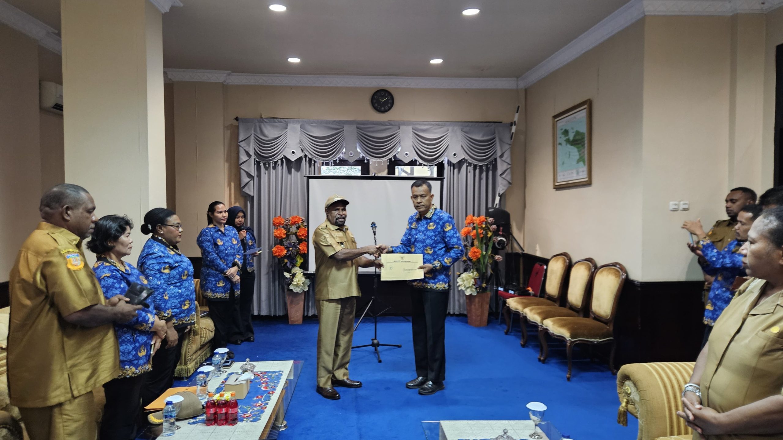 Foto: Irfan | Bupati Jayapura Dr. Yunus Wonda, SH,. MH., ketika menyerahkan SK penunjukan Plt Sekda kepada Dr. Abdul Rahman Basri, S. Sos.,M.KP di VIP Room Kantor Bupati Jayapura, Selasa (17/6).