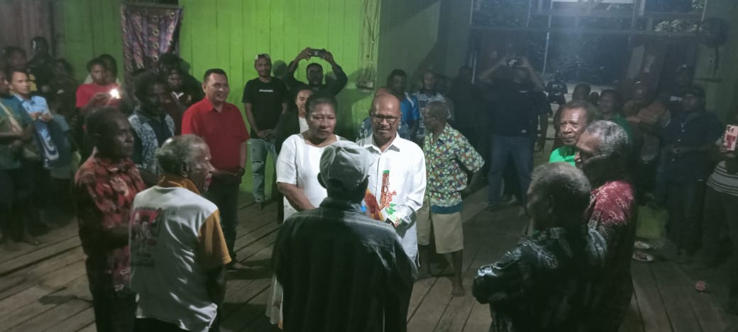 Caption foto : Tampak prosesi pemberian restu oleh pihak adat dan doa berkat pengutusan oleh hamba-hamba Tuhan kepada Cabup, Alpius Toam, ST, MMT di Obhe Babri Imea Kampung Kayeiware Yakonde, Minggu (25/8).