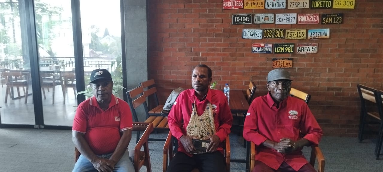 Foto: Irfan | Tampak ketua DPC Barisan Merah Putih (BMP) Kabupaten Jayapura Yakob Fiobetauw bersama Sekretaris BMP Hermes Felle saat memberikan keterangan pers,