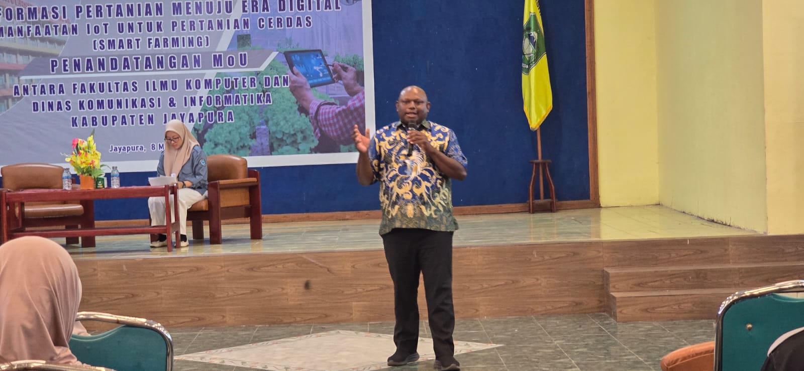 Foto: istimewa / Kepala Diskominfo Kab. Jayapura Gustaf Griapon, ST.,M.Sos sedang menyajikan materi tentang pertanian cerdas kepada mahasiswa Fakultas Ilmu Komputer (FIKOM) Universitas Yapis Papua, Kamis (8/5/25).