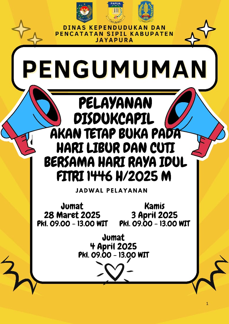 Kepala Disdukcapil Kabupaten Jayapura, Herald J. Berhitu, menjelaskan bahwa pelayanan akan tetap berlangsung selama tiga hari di masa libur dan cuti bersama, yakni Jumat (28 Maret 2025), Kamis (3 April 2025), dan Jumat (4 April 2025).