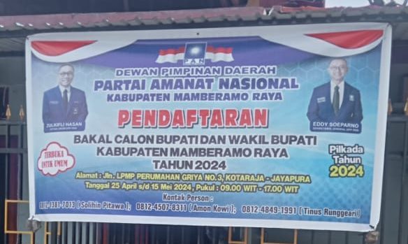 Jurnal Mamberamo Foja, Jayapura – Dewan Pimpinan Daerah Partai Amanat Nasional (DPD PAN) Kabupaten Mamberamo Raya Rabu (15/5) kemarin secara resmi menutup pendaftaran bakal calon bupati dan wakil bupati tahun 2024, yang telah dibuka dan berlangsung di jalan LPMP Perumahan Griya, No. 3 Kotaraja – Kota Jayapura, dari tanggal (25/4).