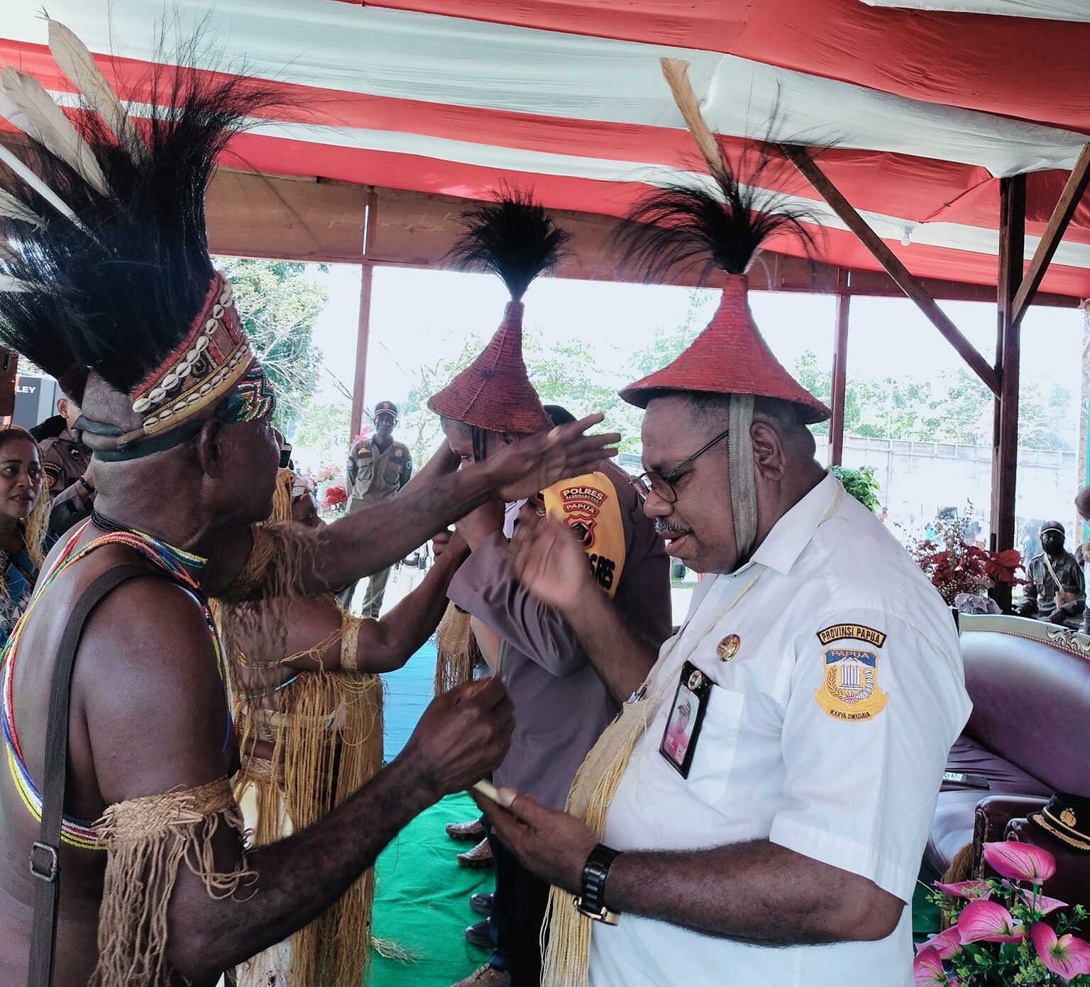 Dok ist/ Sergius Doromi, Pelaksana Tugas Sekretaris Daerah Mamberamo Raya, sedang menerima penganugerahan topi oleh kepala suku