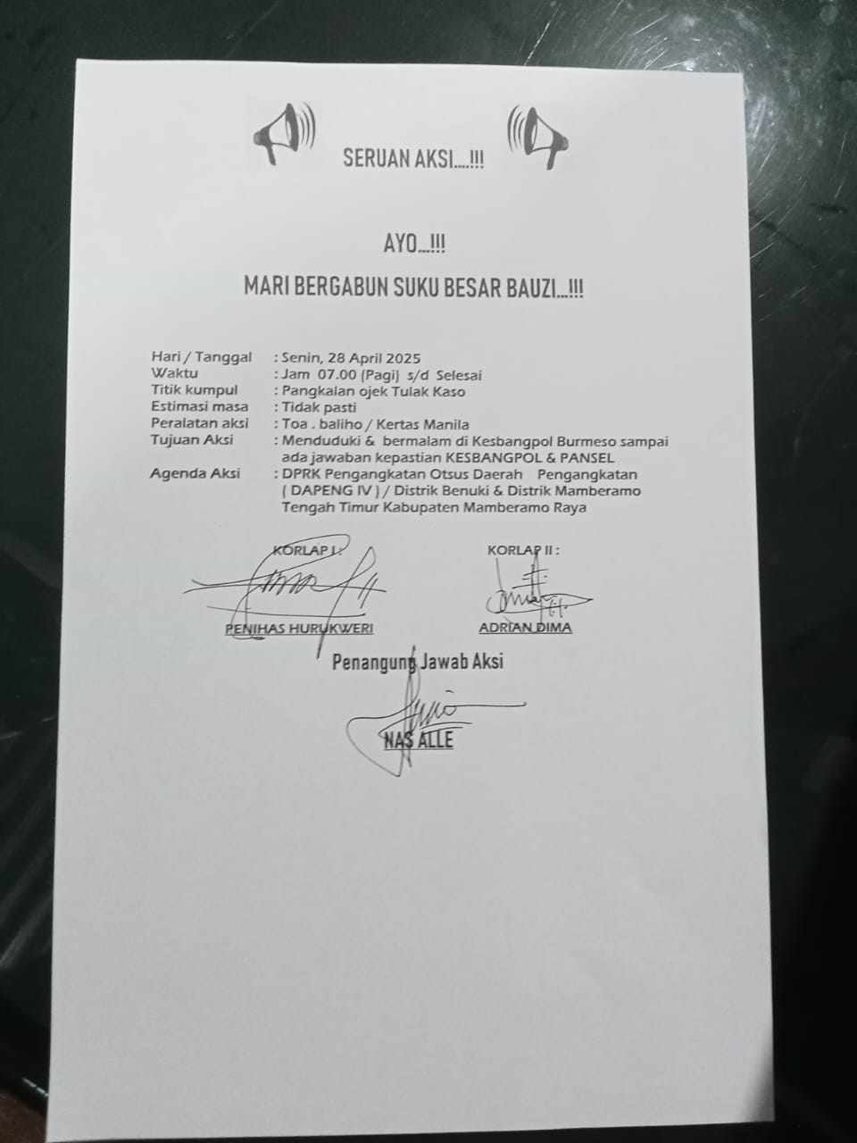 Pernyataan ini disampaikan menyusul rencana sejumlah kelompok masyarakat dari Suku Bauzi di Distrik Mamberamo Tengah Timur dan Benuki yang berencana menggelar aksi demonstrasi pada Senin, 28 April 2025.