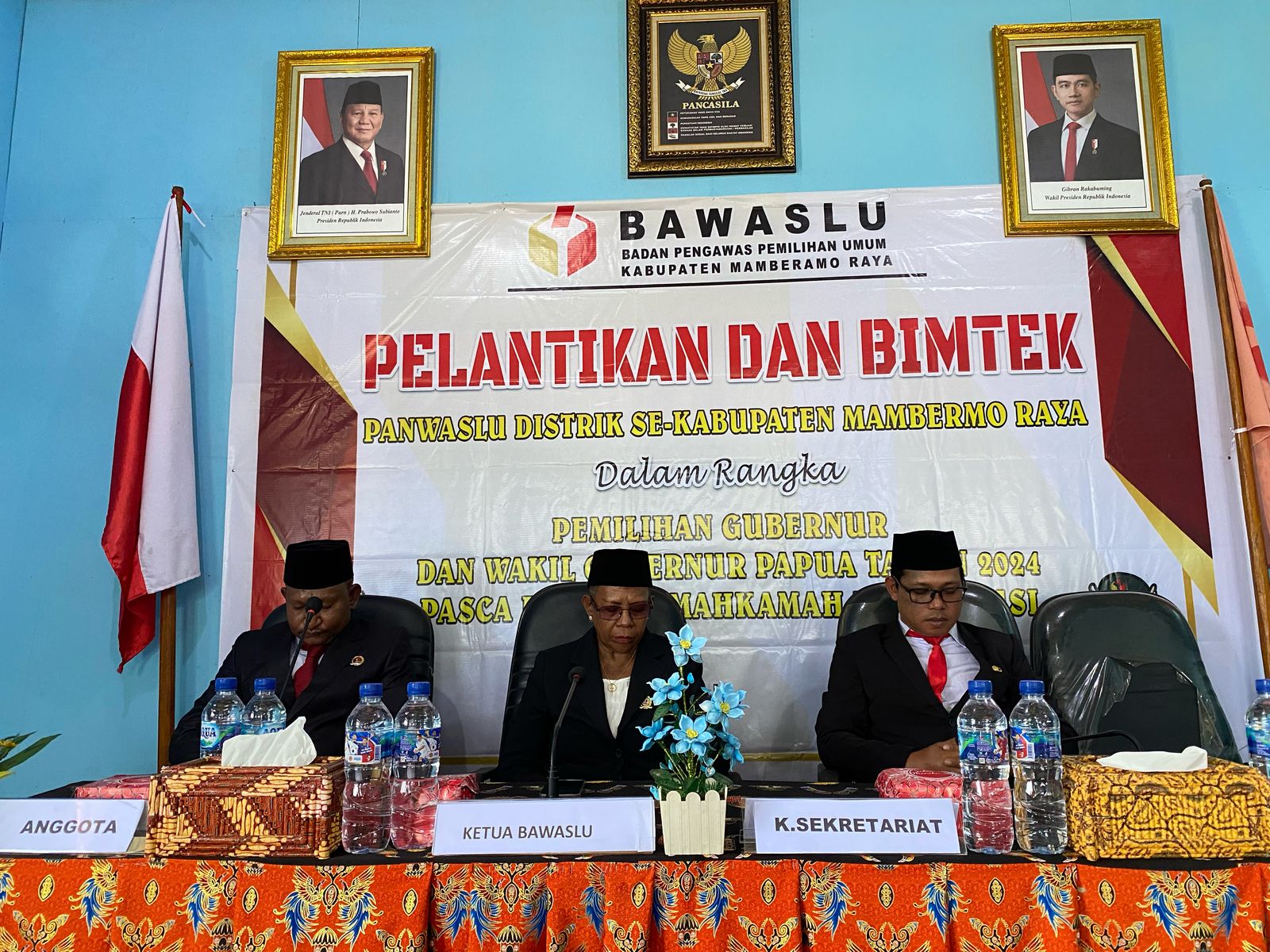 Kasonaweja, Jurnal Mamberamo Foja — Menyongsong pelaksanaan Pemungutan Suara Ulang (PSU) Pemilihan Gubernur dan Wakil Gubernur Papua pada 6 Agustus 2025, Bawaslu Kabupaten Mamberamo Raya resmi melantik anggota Panitia Pengawas Pemilu Kecamatan (Panwascam) serta menggelar Bimbingan Teknis (Bimtek), Kamis (5/6), di Aula Kantor Bawaslu, Kasonaweja.