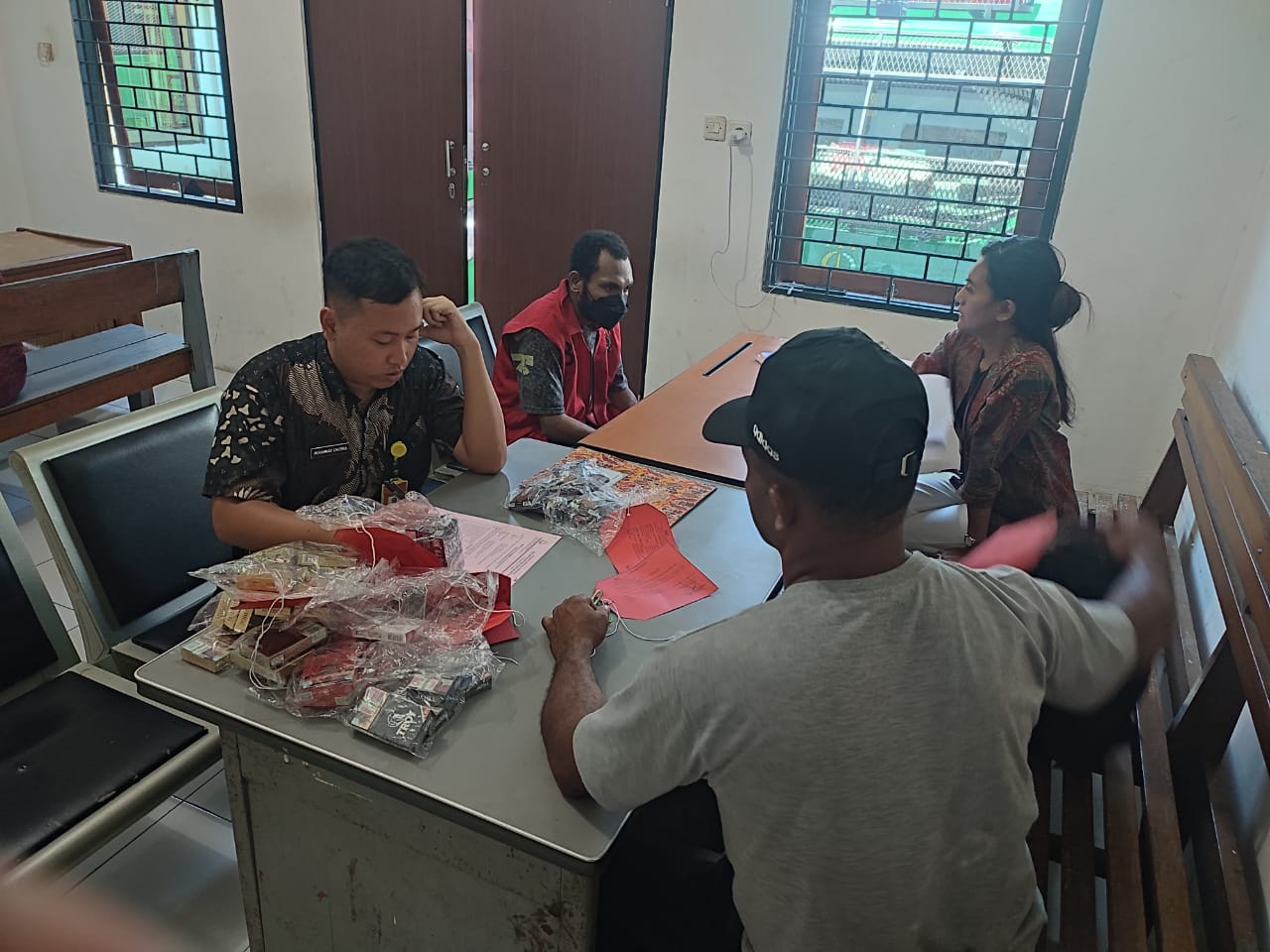 Tersangka berinisial LK diserahkan bersama sejumlah barang bukti, antara lain satu unit laptop Lenovo, satu printer Canon, 30 bungkus rokok berbagai merek, dan satu buah grendel pintu.