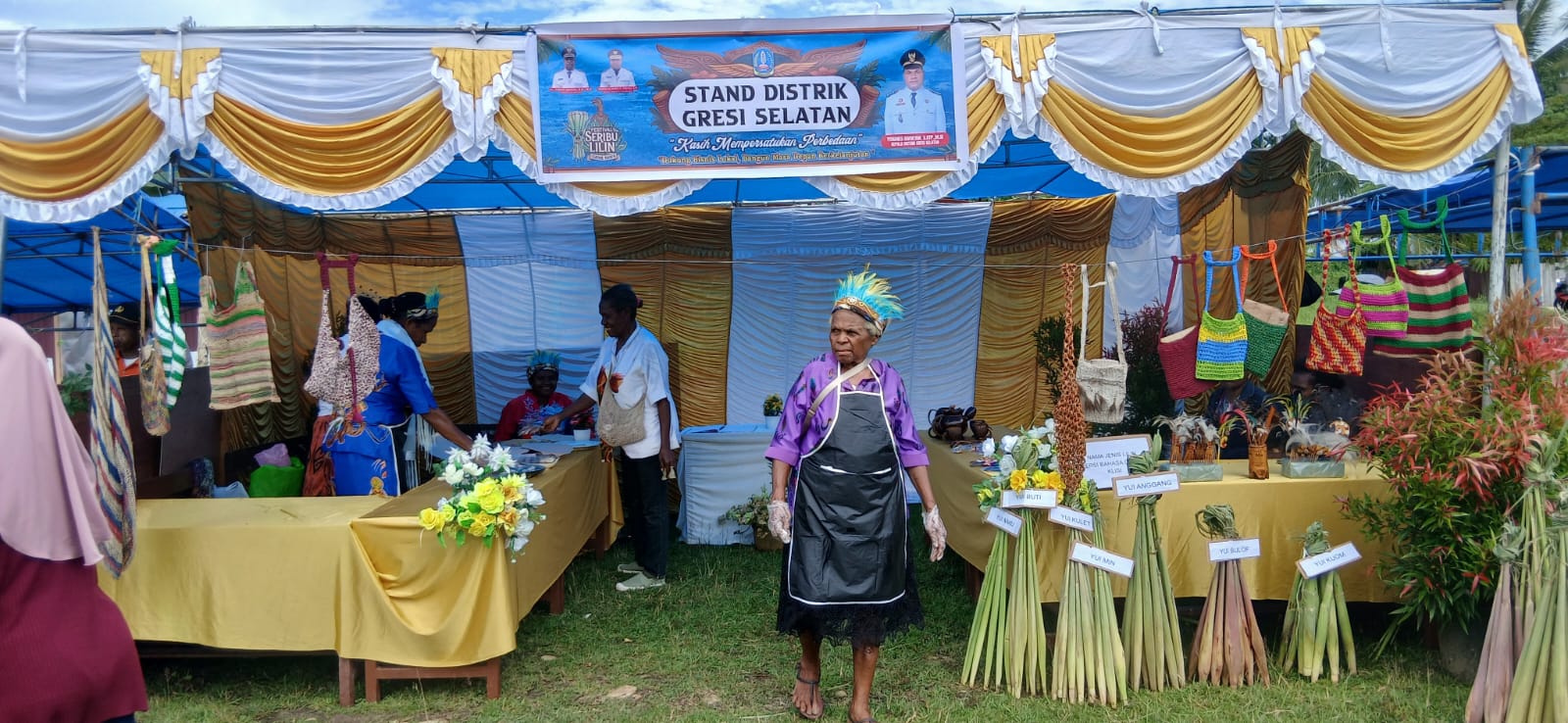 Salah satu yang paling menarik perhatian pengunjung datang dari stand UMKM Distrik Gresi Selatan, yang menampilkan aneka olahan makanan berbahan dasar sayur lilin tanaman khas Lembah Grime Nawa yang selama ini menjadi bagian penting dalam tradisi pangan masyarakat adat.