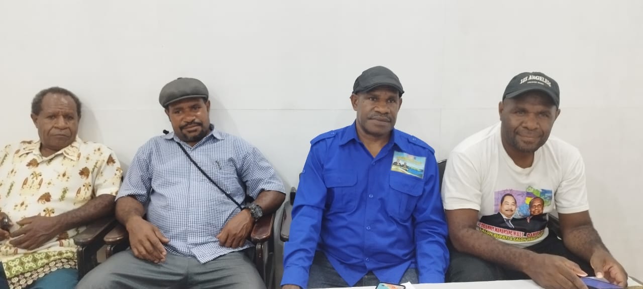Dok JMF/ Ketua tim pemenangan Paslon bupati dan wakil bupati Jayapura nomor urut 4 JMW-DM Sem Gombo di dampingi sekretaris timses Jayapura Emas bersama sejumlah kepala suku, ketika melakukan konfrensi pers.