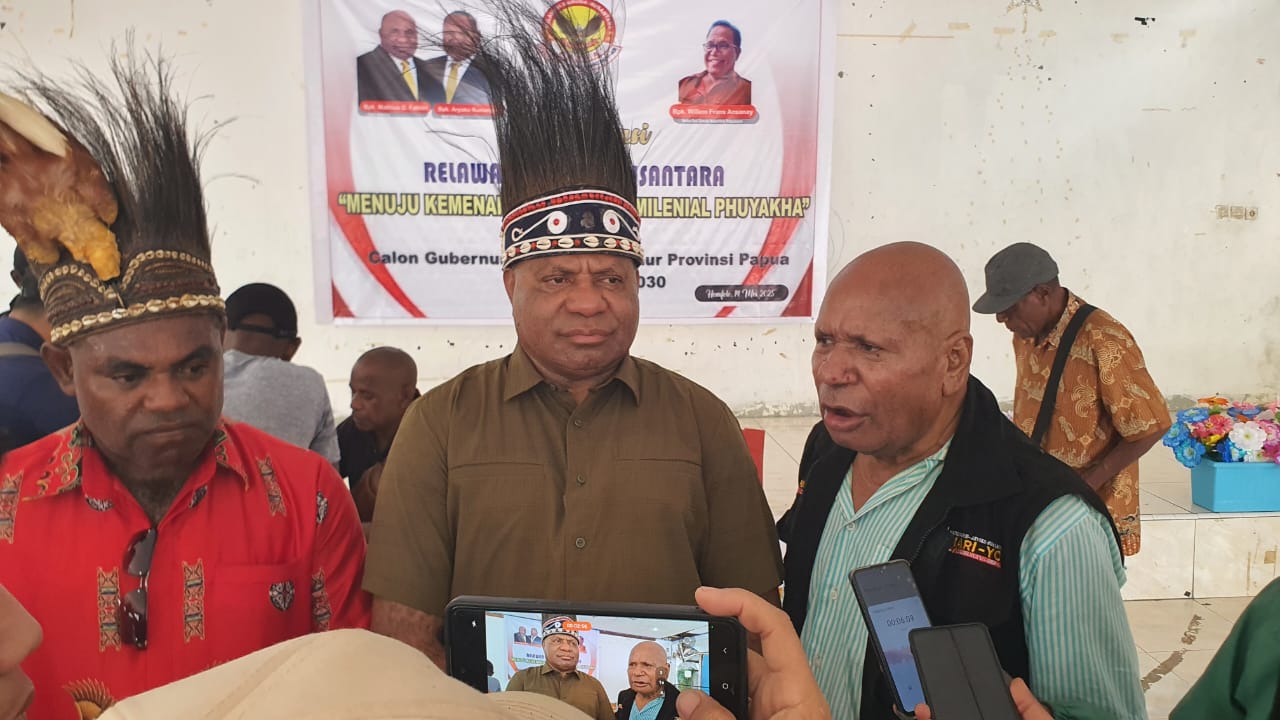 Foto: Irfan / Cagub Papua nomor urut 2, Mathius Derek Fakhiri, diwawancarai usai deklarasi dan pelantikan Relawan Garuda Nusantara di Kampung Adat Homfolo, Distrik Ebungfauw, Rabu (14/5/2025).