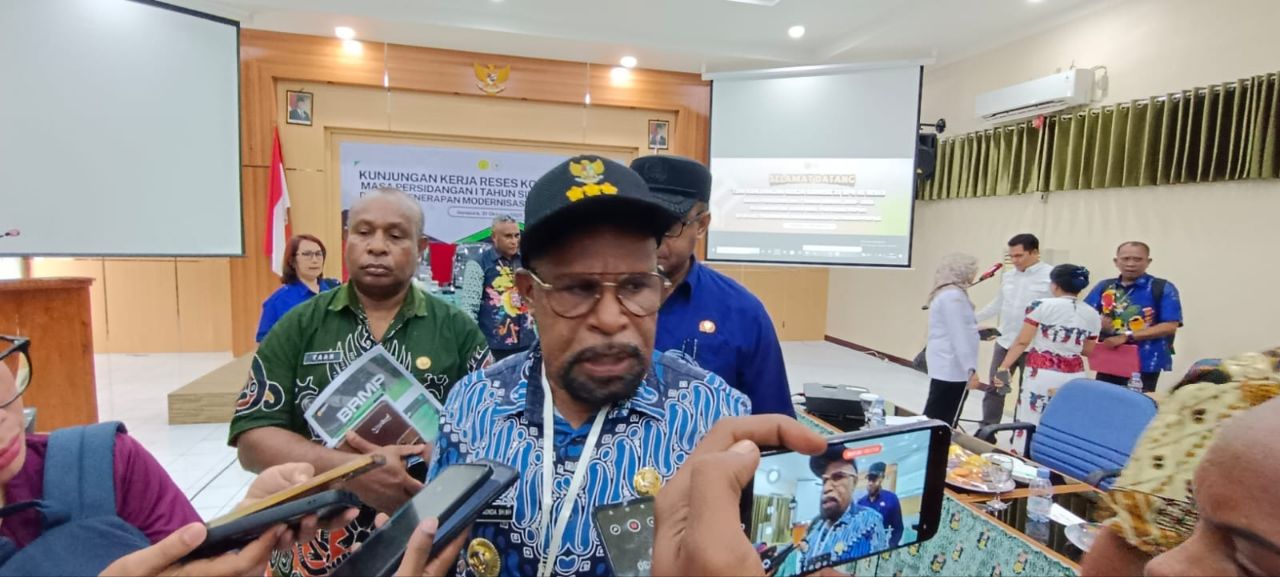 Foto: istimewa | Bupati Jayapura Dr. Yunus Wonda, SH., MH., ketika di wawancarai awak media usai kunjungan Komisi IV DPR RI, Jumat (31/10).