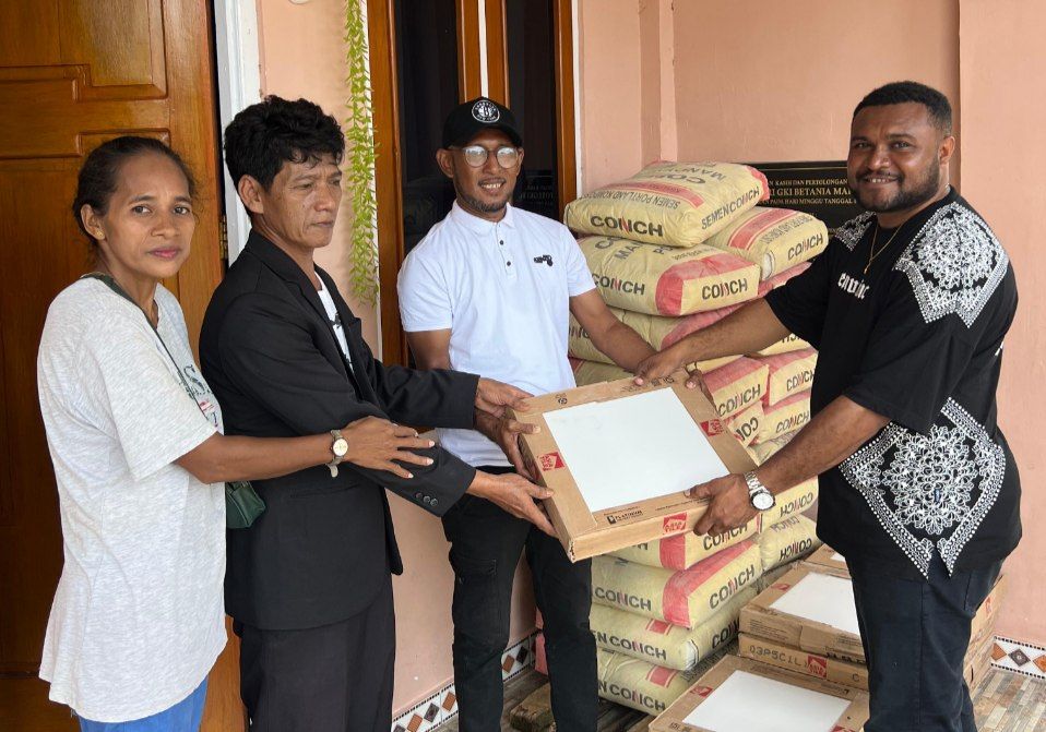 Foto: istimewa | Tampak Moris M. Marini, S.IP., Sekretaris DPD GAMKI Papua bersama Rully Merauje selaku Bendahara, menyerahkan bantuan keramik dan semen, diterima oleh Pdt. Marten Kalo, sebagai Ketua Majelis Jemaat Betania, Jumat (10/4).