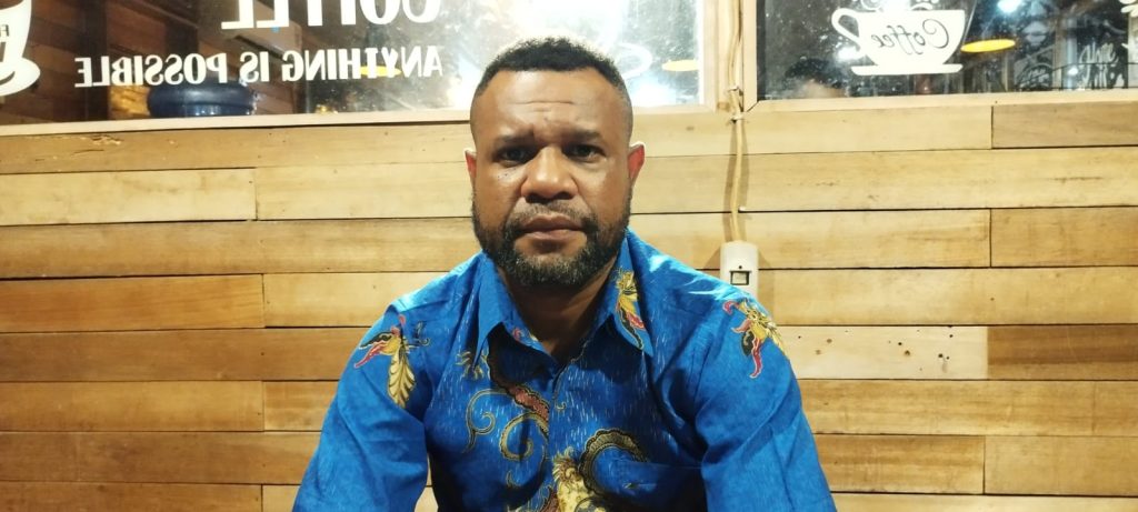 Foto: Irfan | Tampak Yeret Sokoy, calon ketua DPD KNPI Kabupaten Jayapura ketika diwawancarai awak…