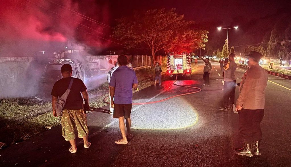 Foto: istimewa | Tampak petugas Pemadam Kebakaran di bantu aparat kepolisian ketika memadamkan api yang…