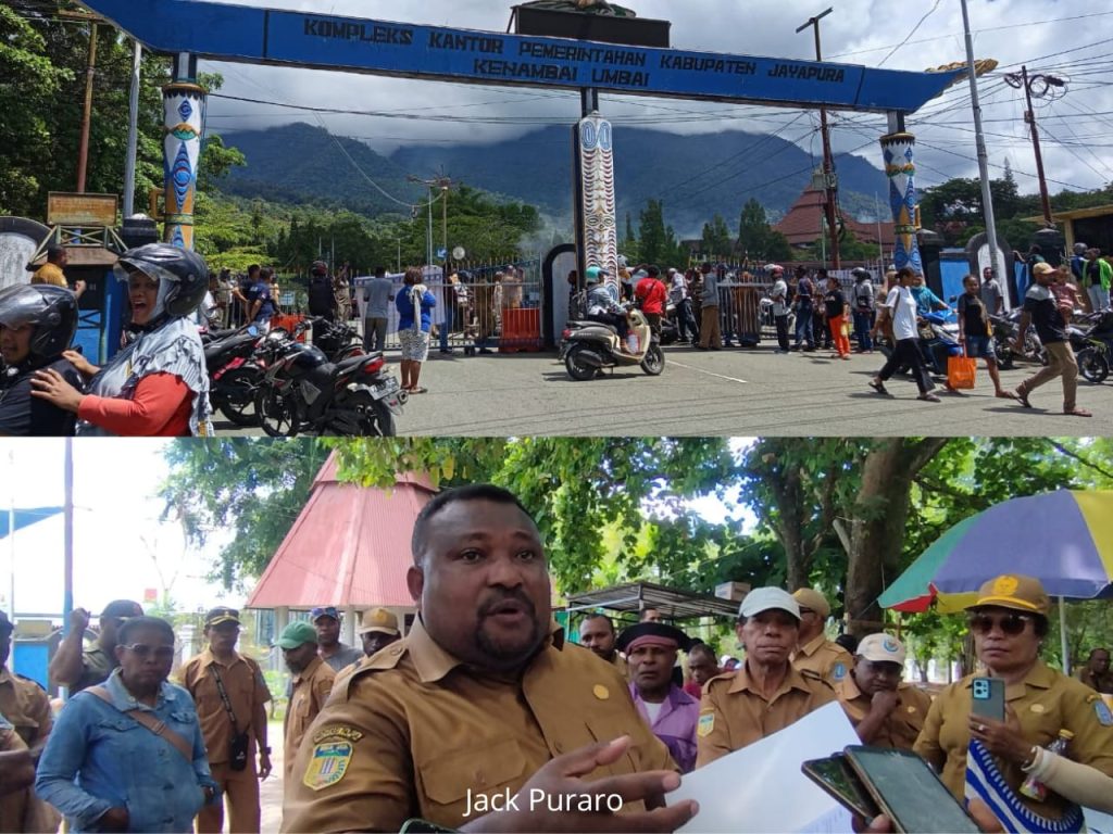 Foto: Irfan /Pemalangan gerbang utama kantor bupati Jayapura, (Insert: Jack Puraro, koord aksi) Sentani, jurnalmamberamofoja.com…