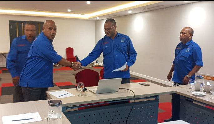 Foto: Andre Fon /Tampak ketua Pansel Nelius Awaki bersama Korneles Dasinapa jabat tangan Jayapura, Jurnal…