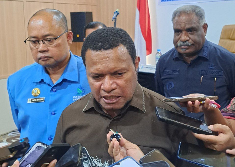 Foto: Irfan | Tampak Wakil Bupati Jayapura, Haris Richard S. Yocku, SH., ketika diwawancarai oleh…