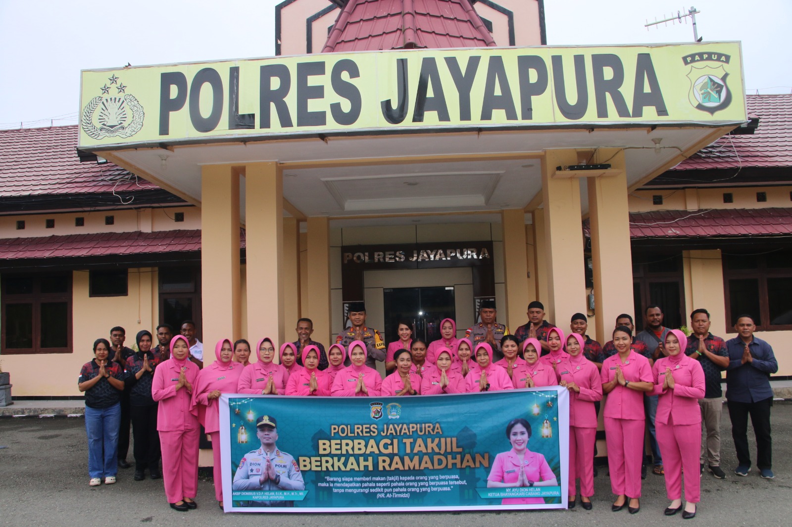 Kapolres Jayapura AKBP Dionisius V.D.P. Helan, S.I.K., M.H., M.Tr.Mil., bersama Wakapolres Jayapura Kompol Erol Sudrajat, S.Sos., M.Si., didampingi Kasat Reskrim AKP Alamsyah Ali, S.H., M.H., serta Ketua Bhayangkari Cabang Jayapura Ny. Ayu Dion Helan, turun langsung ke jalan untuk membagikan takjil kepada masyarakat.