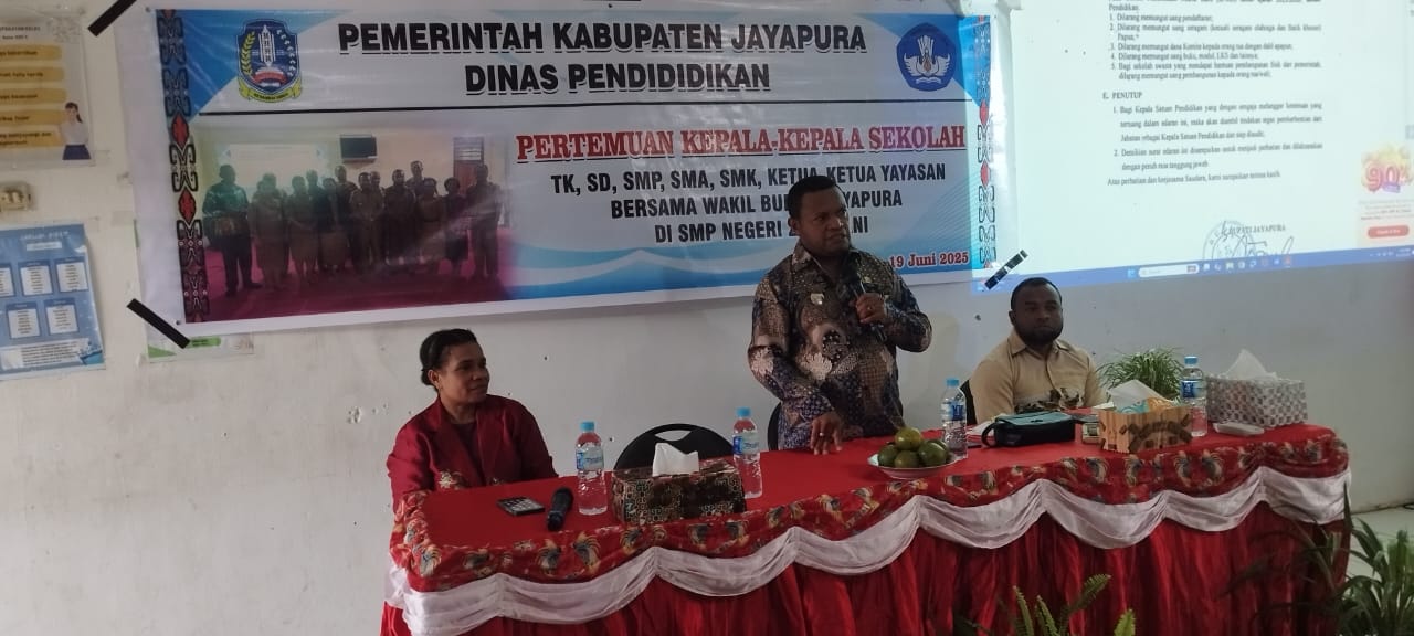 Sentani, Jurnal Mamberamo Foja – Wakil Bupati Jayapura, Haris Richard S. Yocku, menggelar pertemuan kedua bersama para kepala sekolah TK, SD, SMP, SMA/SMK negeri dan swasta serta para ketua yayasan pendidikan se-Kabupaten Jayapura, Kamis (19/6/2025), di SMP Negeri 2 Sentani.
