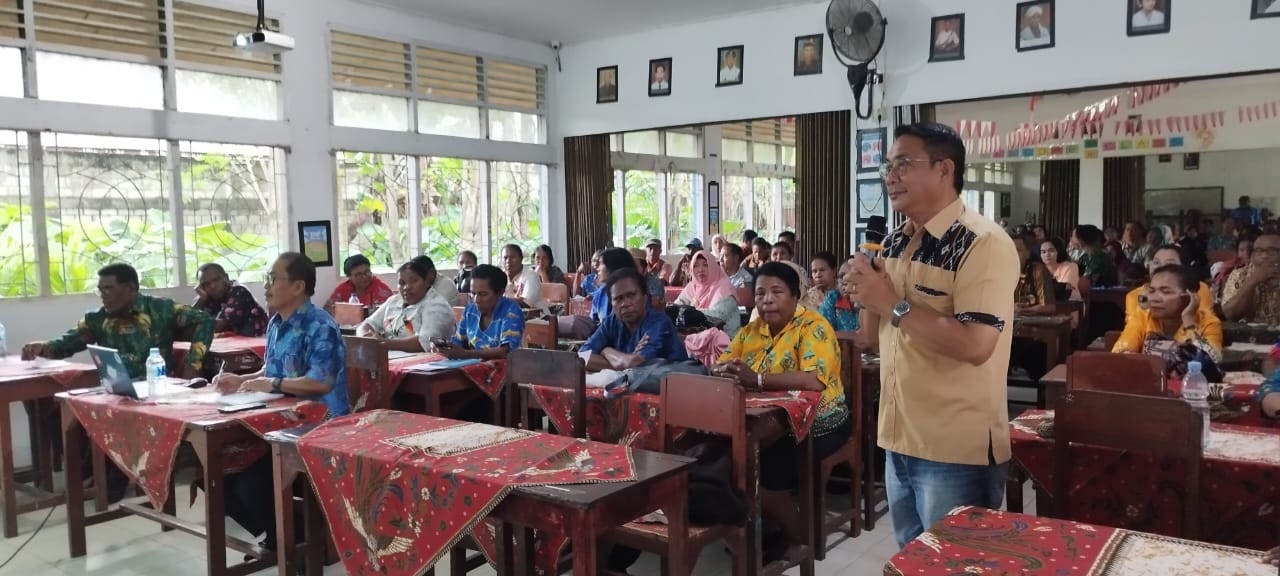 Foto: Irfan | Wabup Haris Richard S. Yocku, SH., didampingi Sekretaris Dinas Pendidikan Kabupaten Jayapura Demas Worumi dan Kepala SMPN 2 Sentani Kelasina Yanggroserai ketika memberikan arahan pada pertemuan dengan Kepala-kepala Sekolah TK, SD, SMP SMA/SMK Se- Kabupaten Jayapura di SMP Negeri 2 Sentani, Kamis (19/6).